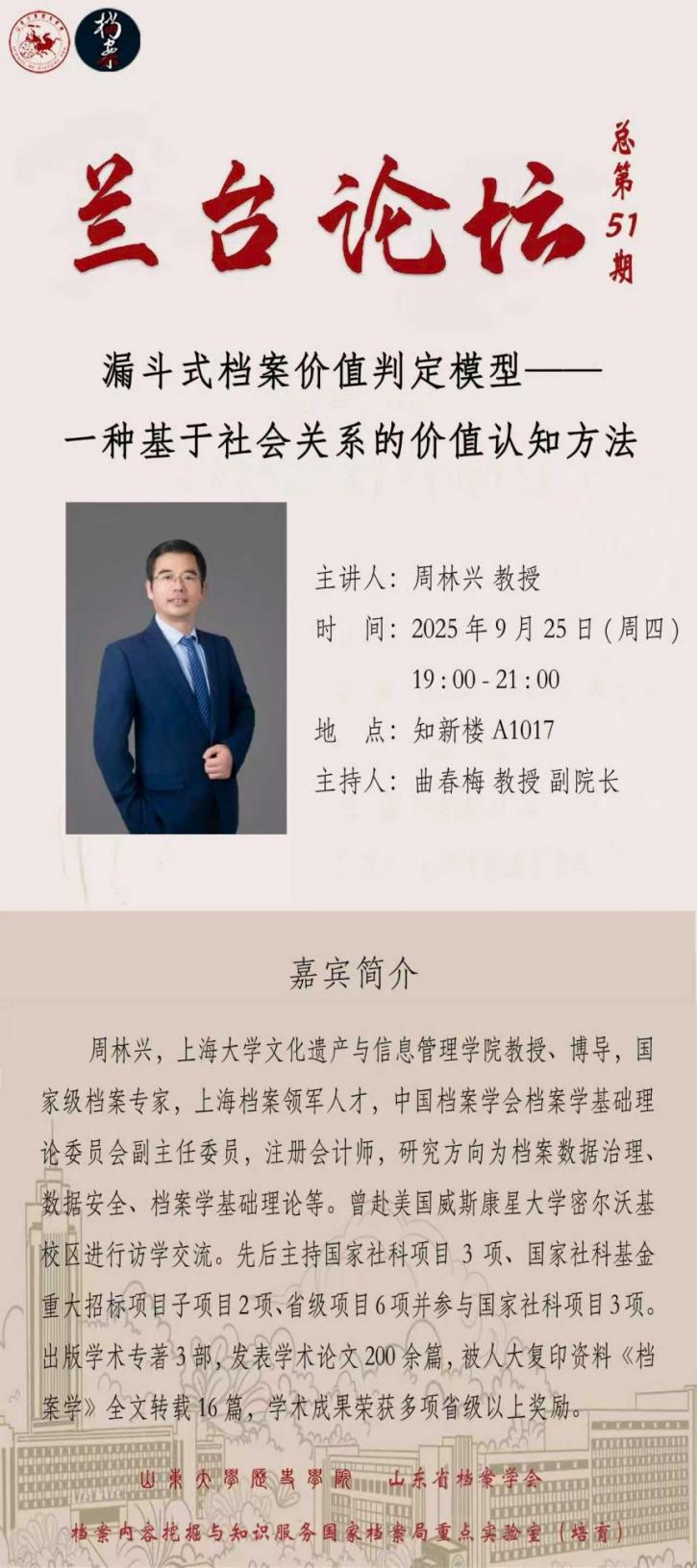 9月25日晚,上海大学文化遗产与信息管理学院教授、博导,国家级档案专家,中国档案学会档案学基础理论学术委员会副主任委员周林兴教授作客“兰台论坛”,为我校师生作题为“漏斗式档案价值判定模型——一种基于社会关系的价值认知方法”的专题学术讲座。历史学院副院长曲春梅教授主持讲座。