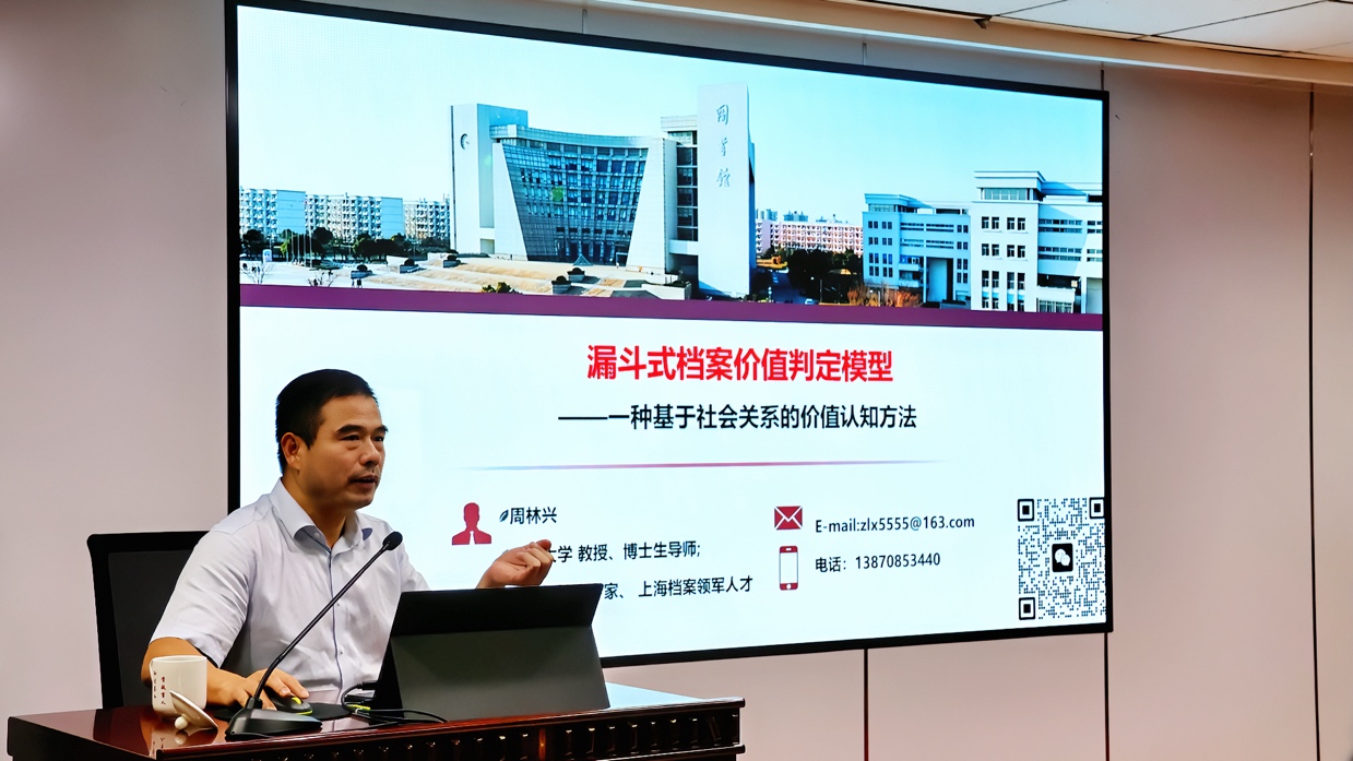 周老师以“八千麻袋事件”为例,论述了档案价值本质上应是基于社会关系的动态认知,传统以“一元社会关系”判定档案价值的方法存在局限,易因单一视角导致档案被误判或销毁。随后,周老师重点介绍了其研究成果“漏斗式”档案价值判定模型,即通过增加和集合多种社会关系主体和视角,使档案在通过“漏斗”时,能根据每个环节的价值判定标准被筛选和保留,使被判定的档案从“一元社会关系定生死”转化为“N元社会关系助生存”。这一机制以“我”为主、以“广”为基、以“数”为媒、以“用”为本,旨在最大限度保留档案数量、激发社会主体参与、强化档案的社会功能。最后,周老师总结指出,在数字时代,技术放大了档案的价值,因此,应建立基于“关系维”“时间维”与“空间维”的立体判定模型,以发展的、历史的眼光保障每一份档案的“生存权”,从而准确把握档案数据的社会关系变迁。